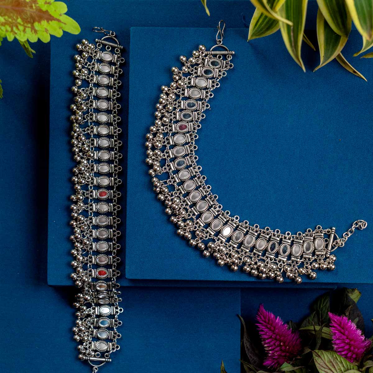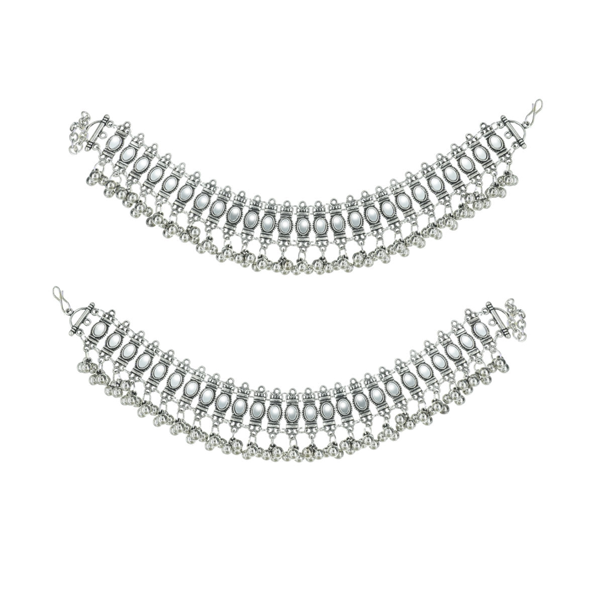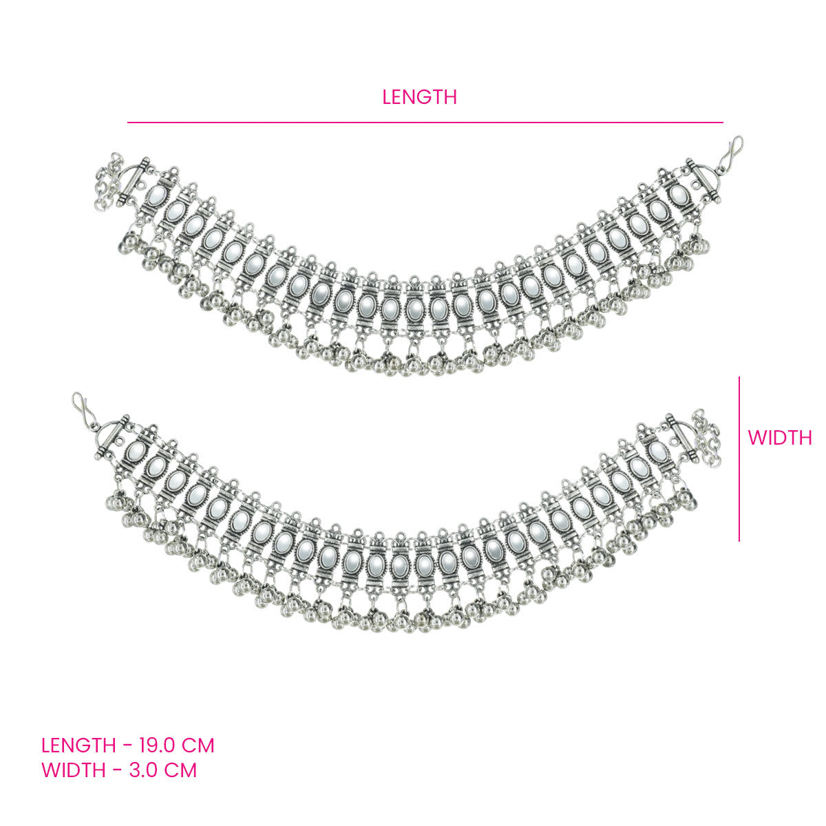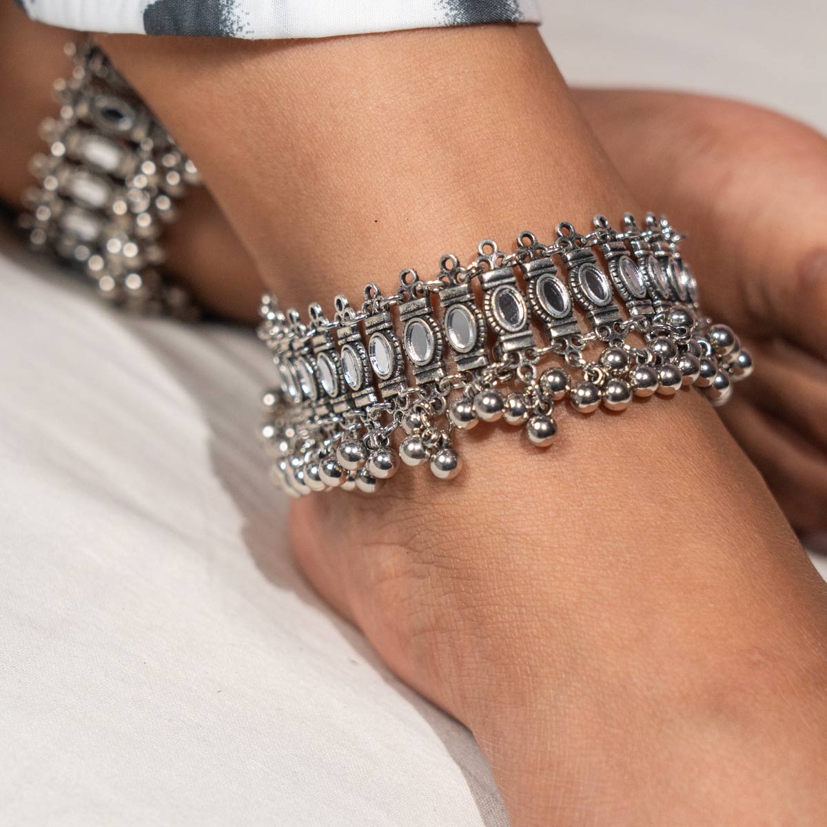 Design: Traditional oxidised silver anklets with detailed oval motifs and ghungroo danglers