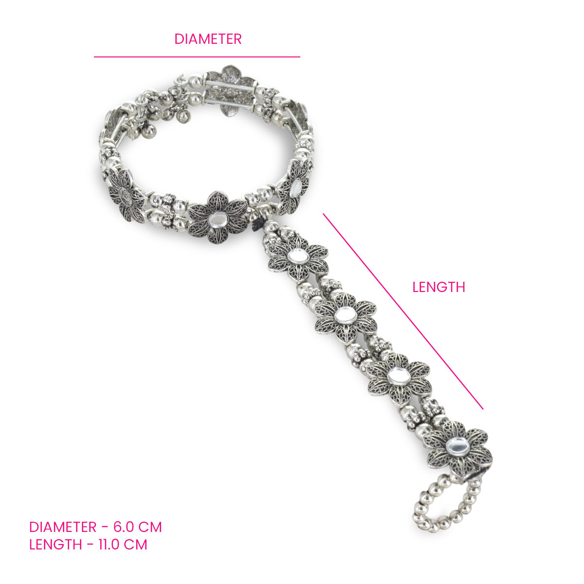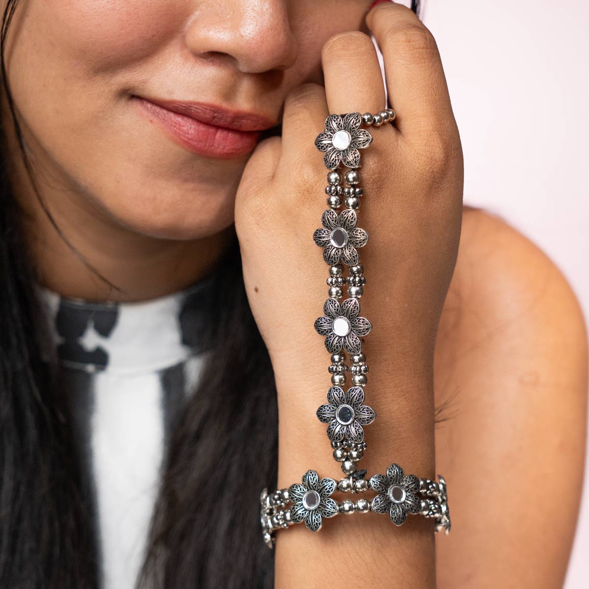 Design: Modern fusion of a kada and hand chain adorned with intricate floral patterns