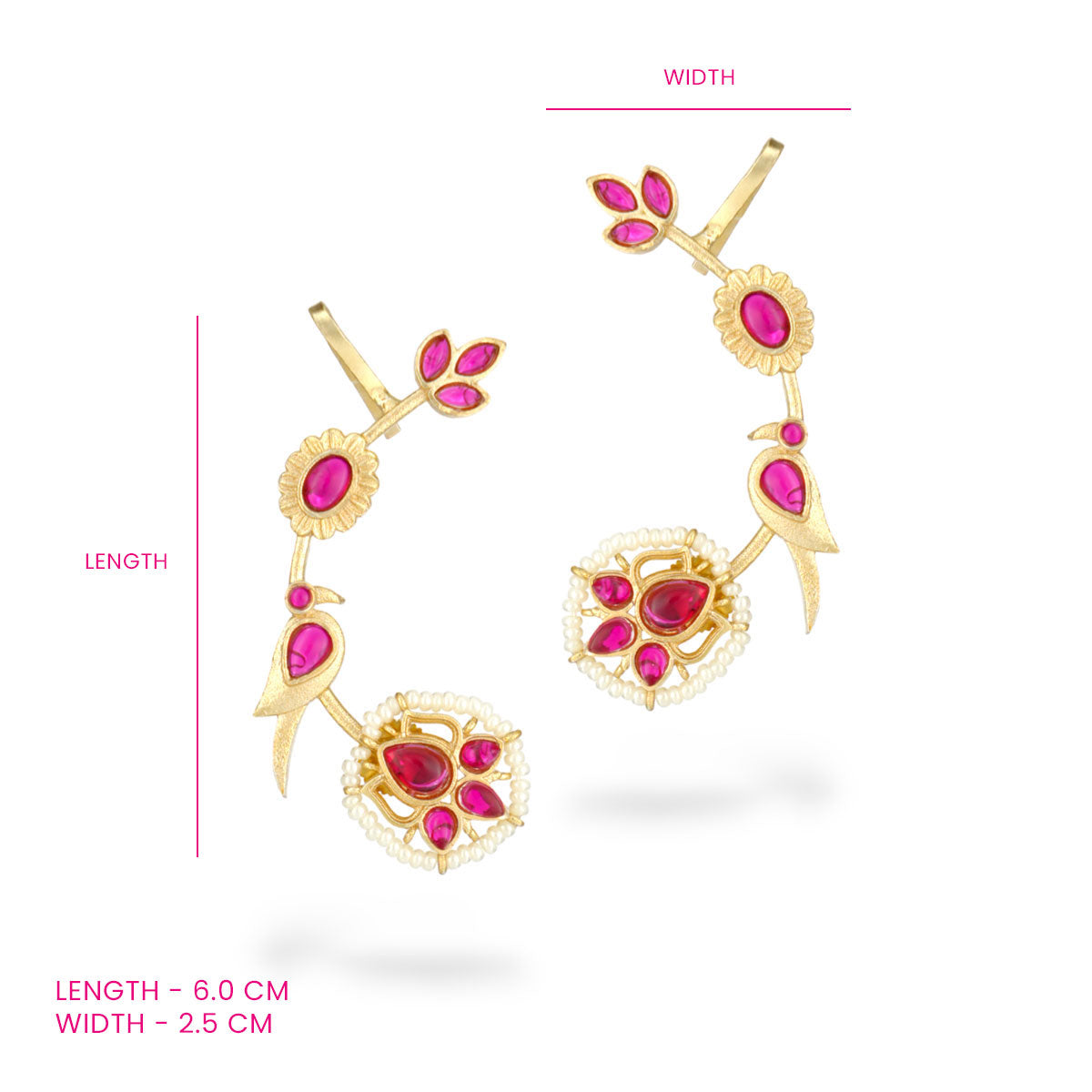 Style Tip: Pair Gulnaar Pearl Ear Climbers with lehengas, fusion sarees, or Indo-western outfits to highlight the floral detailing and pop of pink.