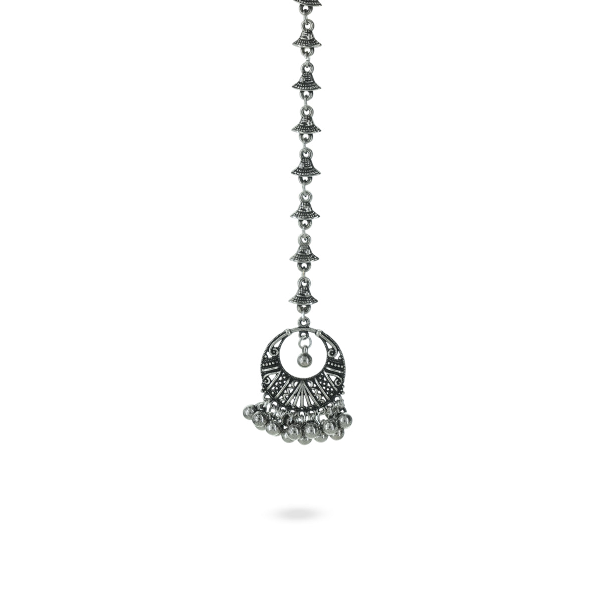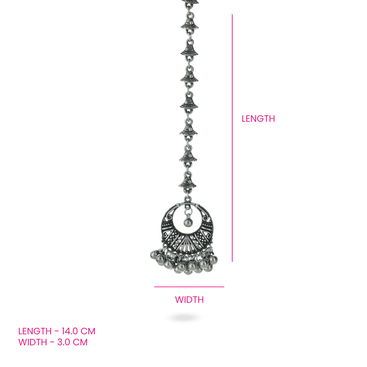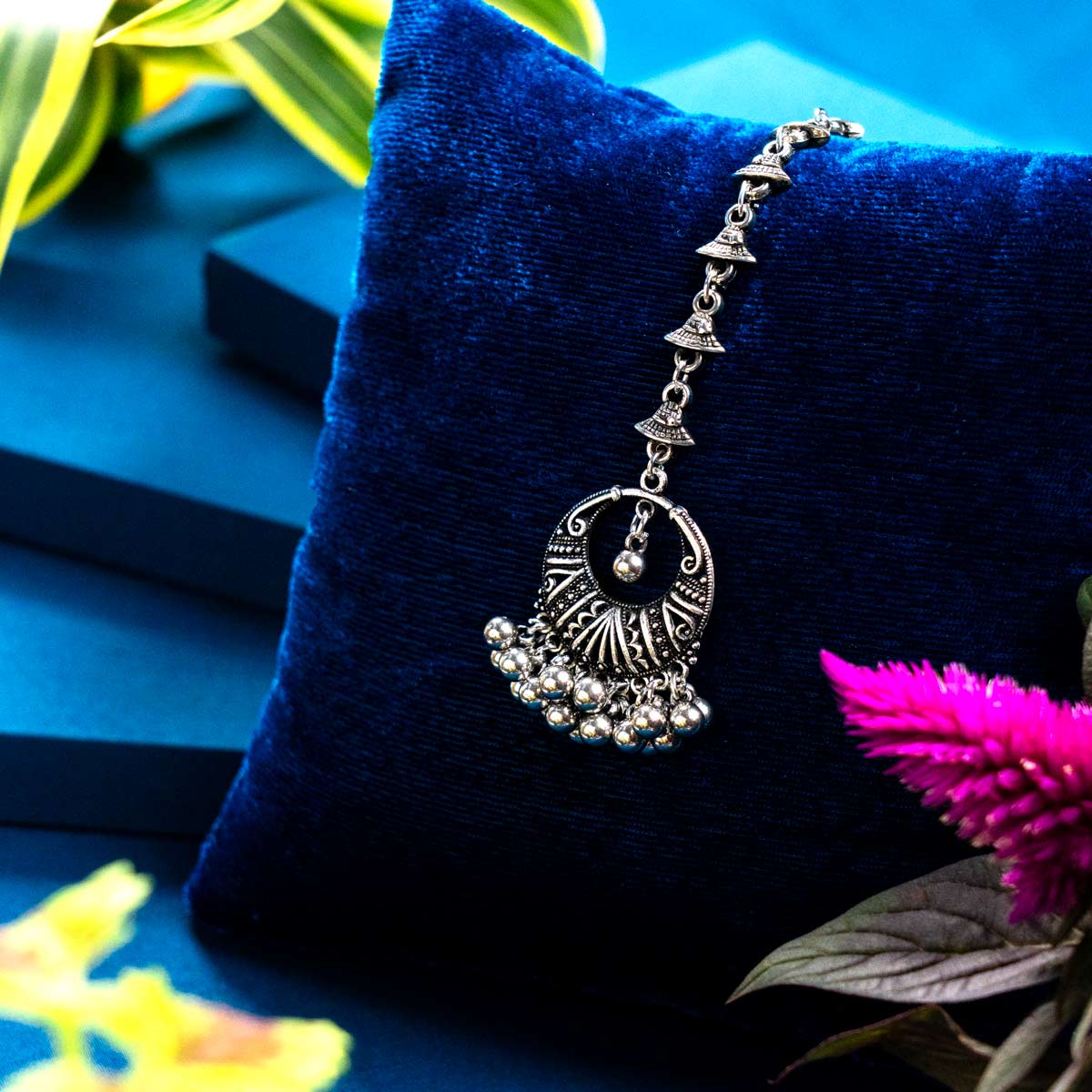 Material: Made from oxidised silver finish alloy with detailed metal carvings and silver-toned bead embellishments.