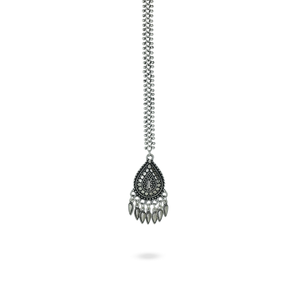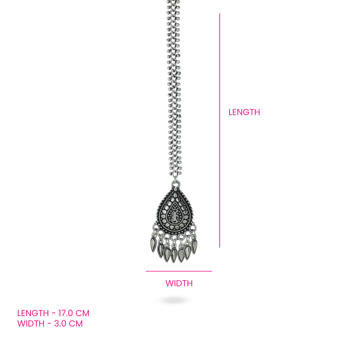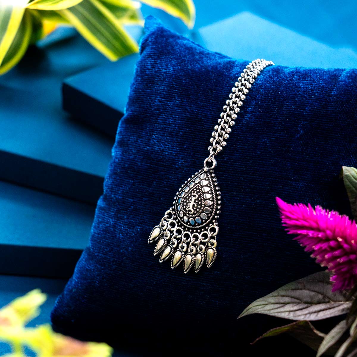 Design: Teardrop-shaped bindi with embossed motifs and dangling charms