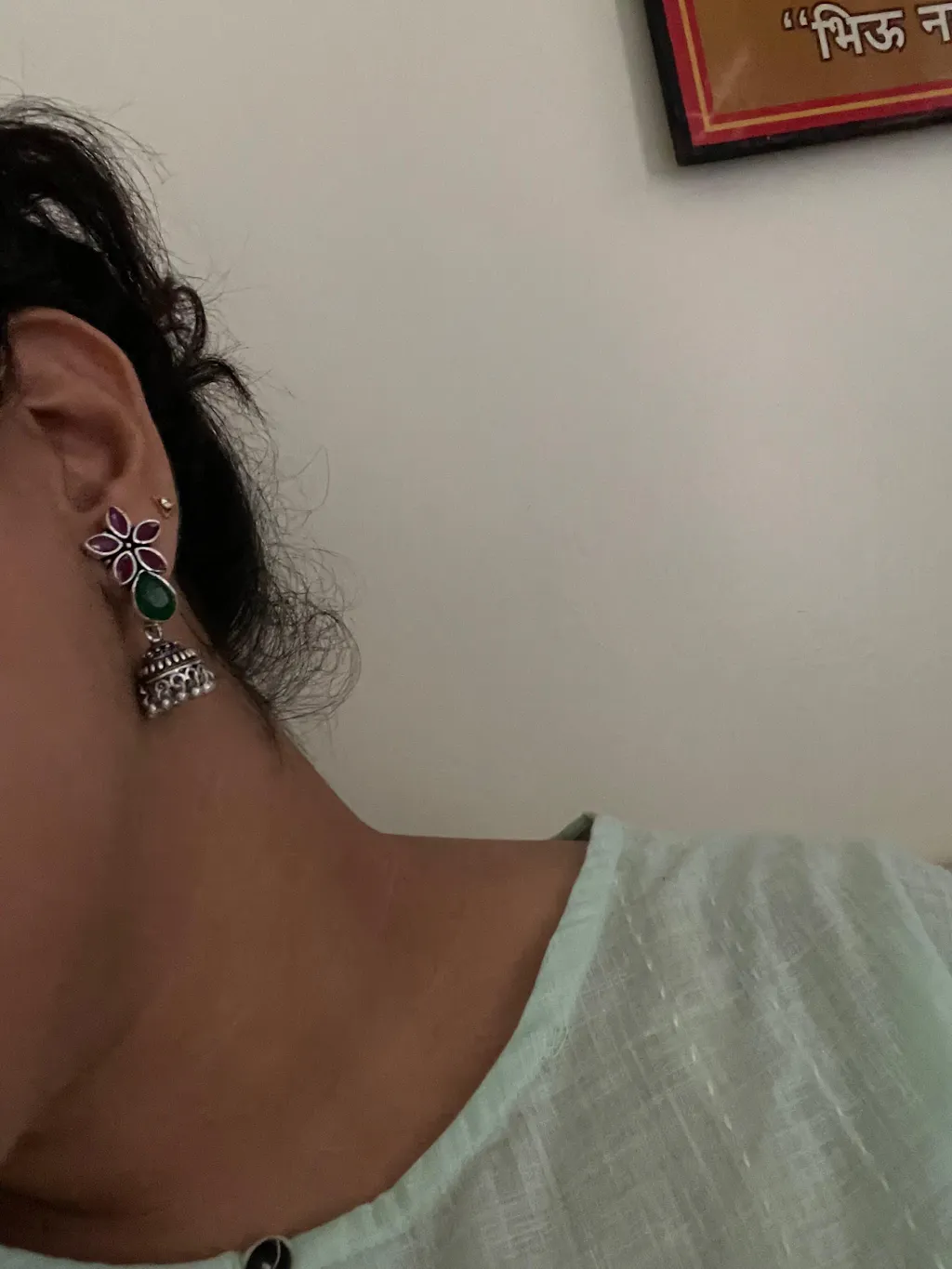 Design: Featuring an intricate floral design in combination with traditional jhumki base, this earring is accented with green and pink stones.