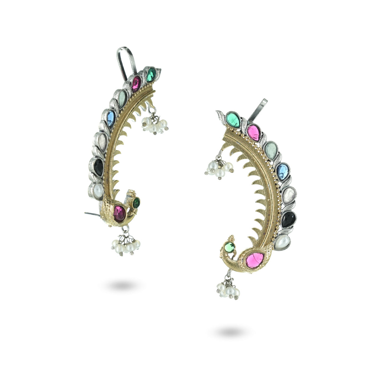 Material: Premium brass with oxidised and antique gold finish, embellished with multicolor stones and pearl bead drops.