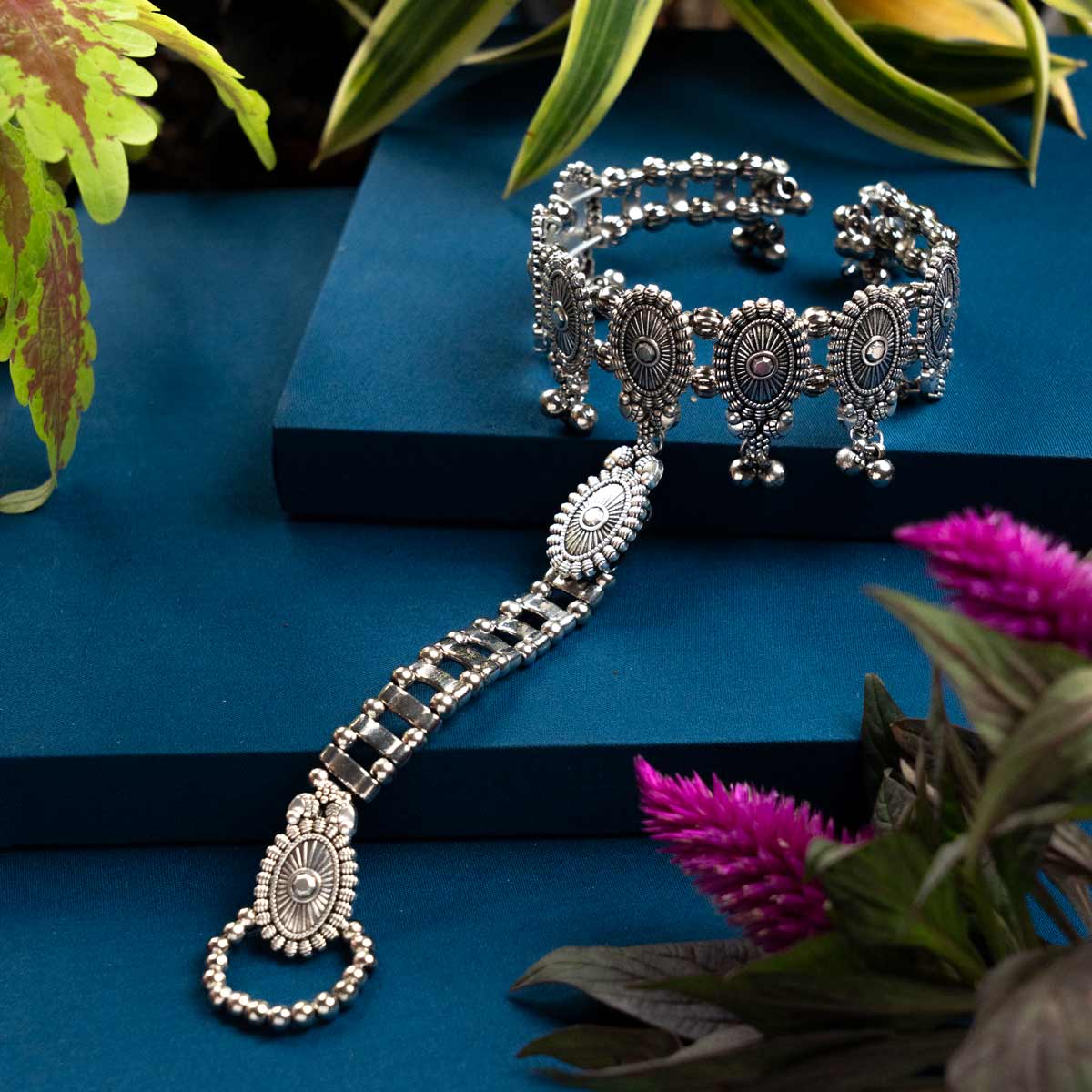 Design: Modern fusion of a kada and hand chain adorned with intricate floral patterns