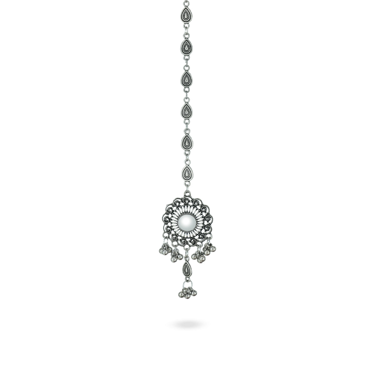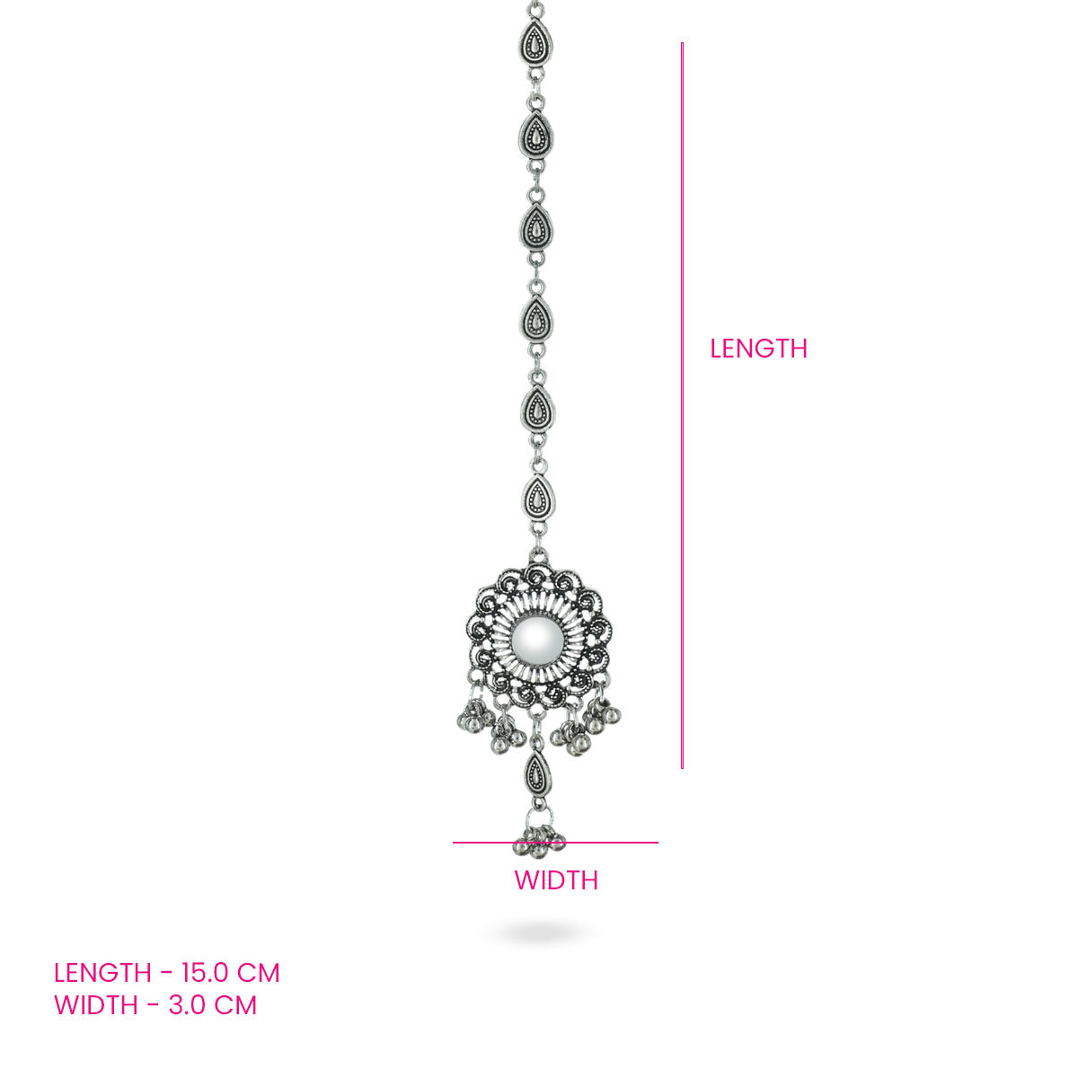 Material: Oxidised silver finish alloy with mirror inlay and silver-toned bead embellishments.