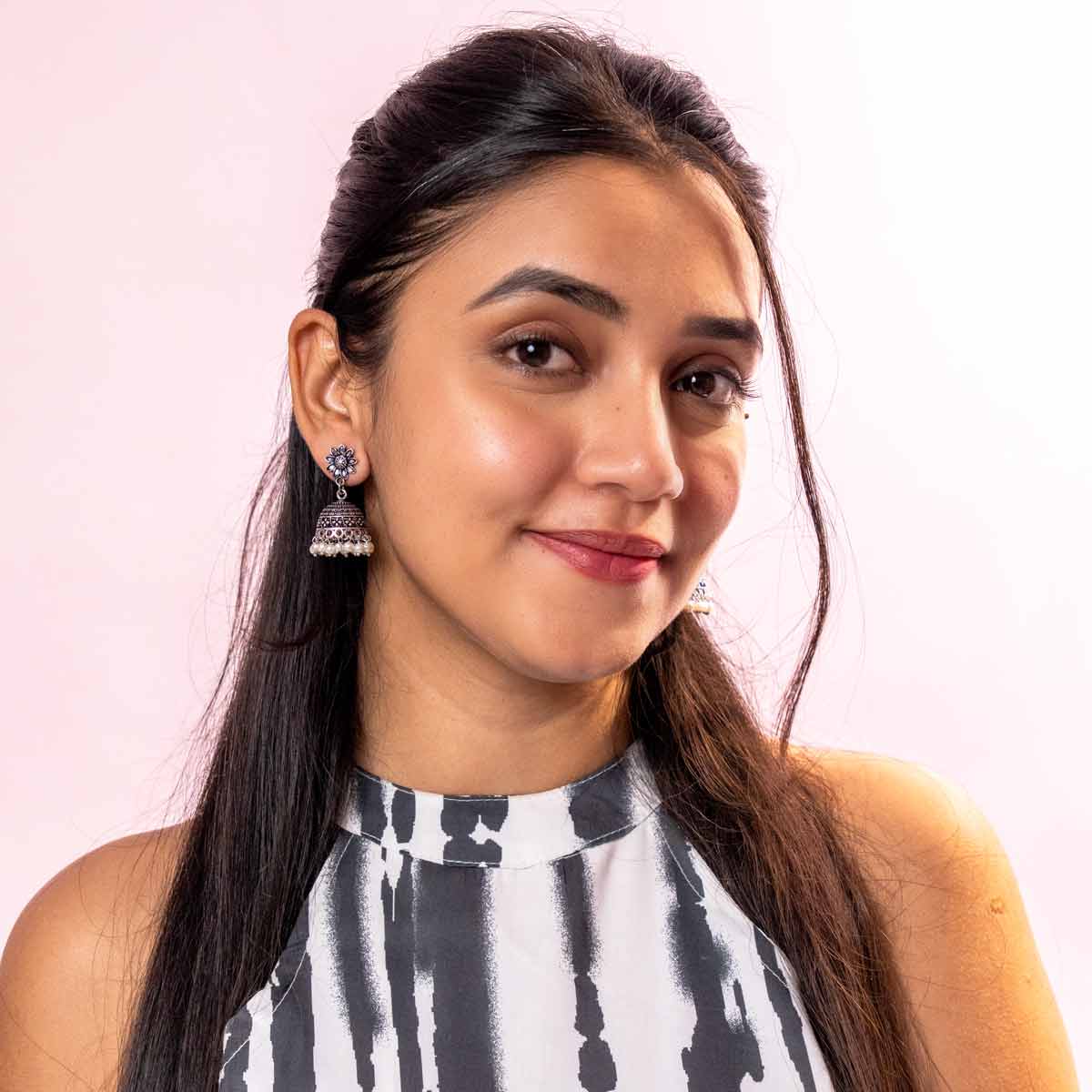 Design: A Featuring an intricate floral design in combination with traditional jhumki base, this earring is accented with green and pink stones.
