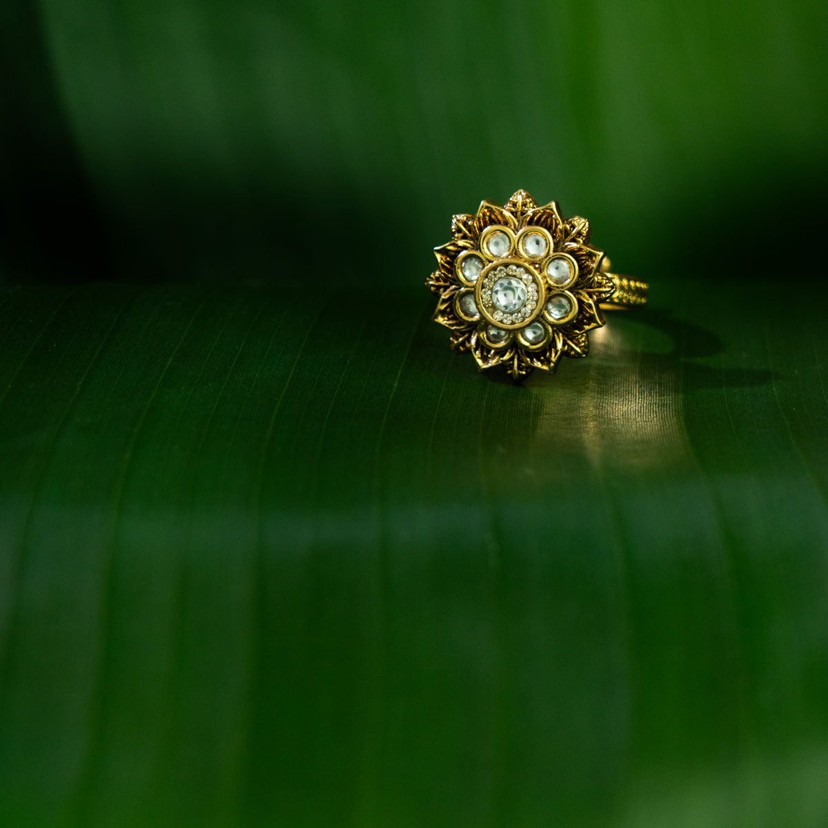Design: A radiant floral-inspired statement ring featuring layered petal motifs and a central kundan stone, reflecting nature-led heritage elegance.