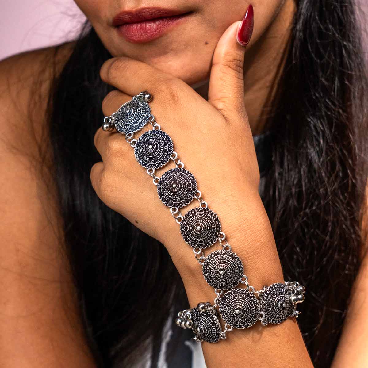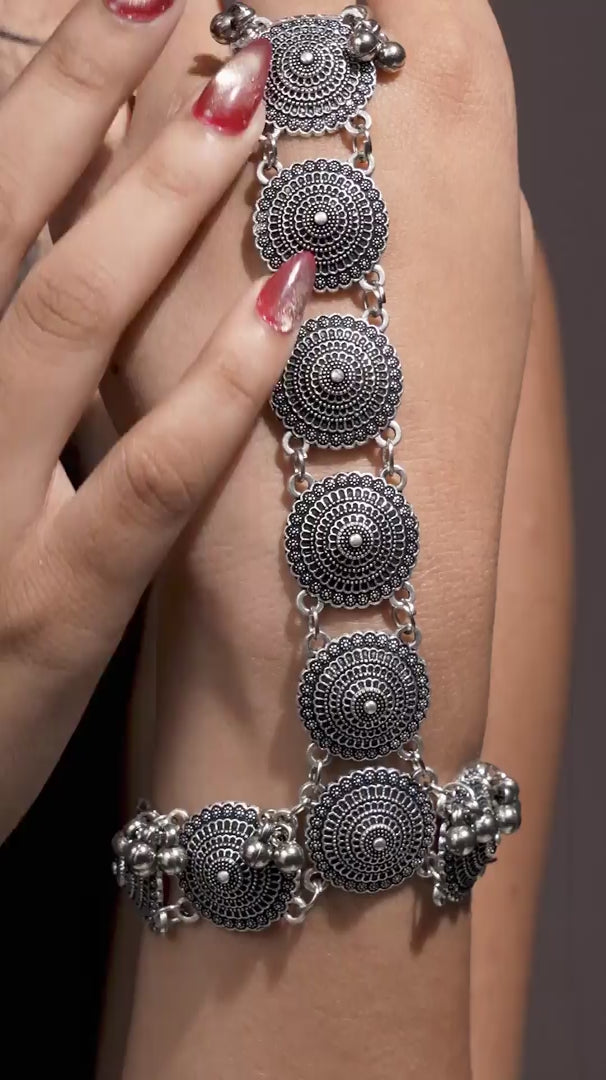 Design: Modern fusion of a kada and hand chain adorned with intricate floral patterns